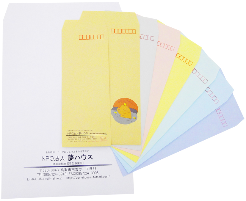 ■はがき・封筒印刷年賀状や喪中はがきなどのデザインから印刷までを行います。そのほか、角2・長3等のいろんな種類の封筒作成も行っています。 |